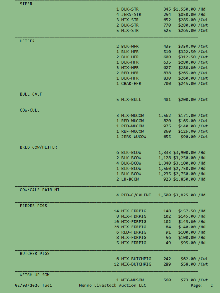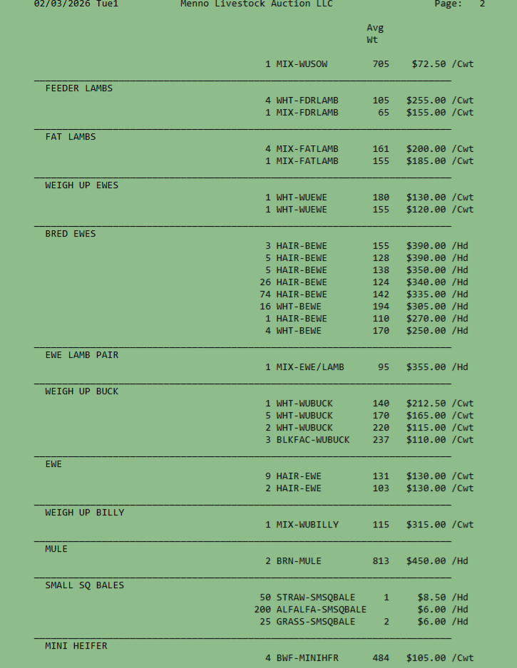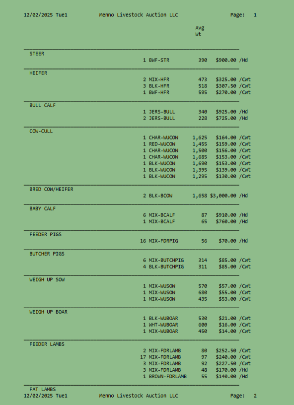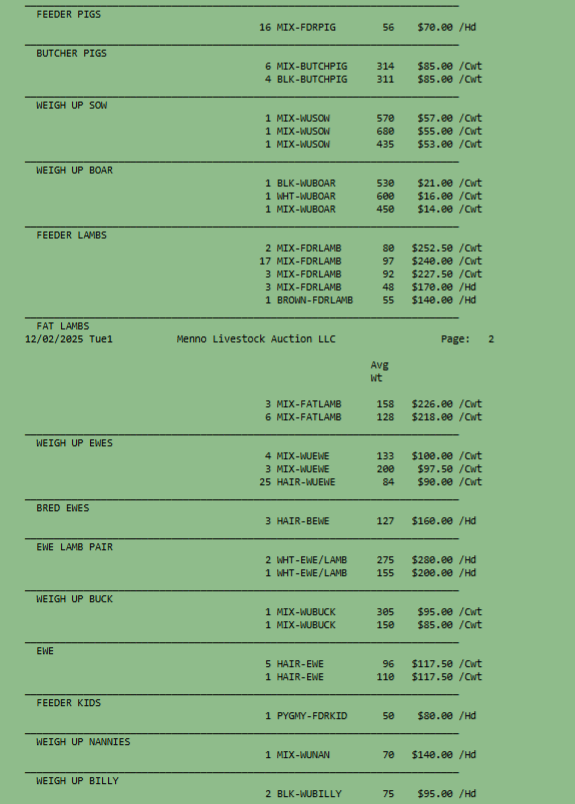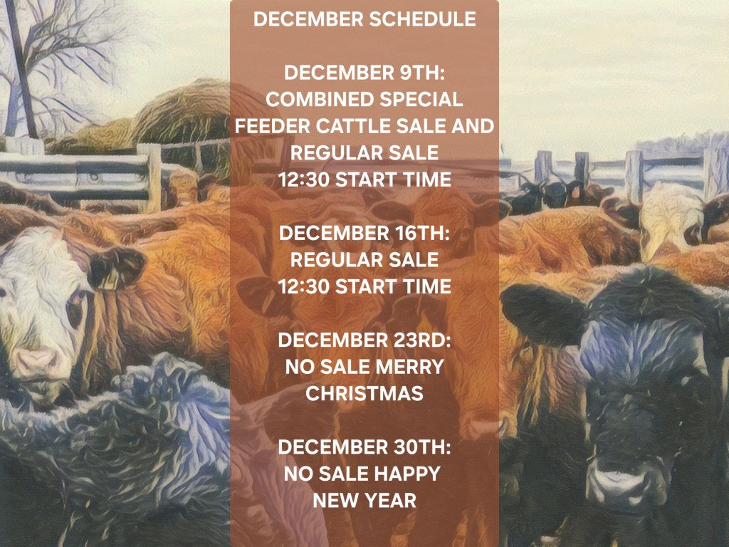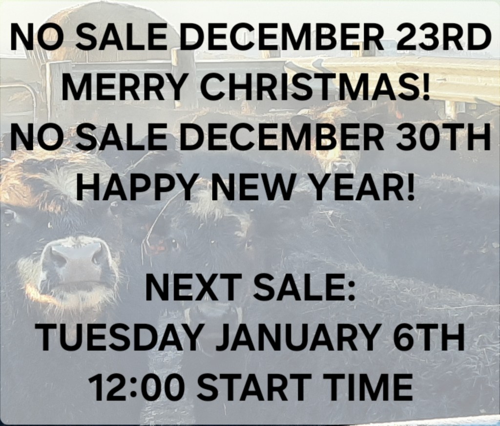 SALE SCHEDULE: 12:00 START TIME Sows/Boars/Butcher Hogs, Feeder Pigs, Followed by Sheep, Goats, Equine, Hay, Misc, Bred Cows/Cow Calf Pairs, Weigh up Cows, Bulls, Baby Calves, Feeder Cattle